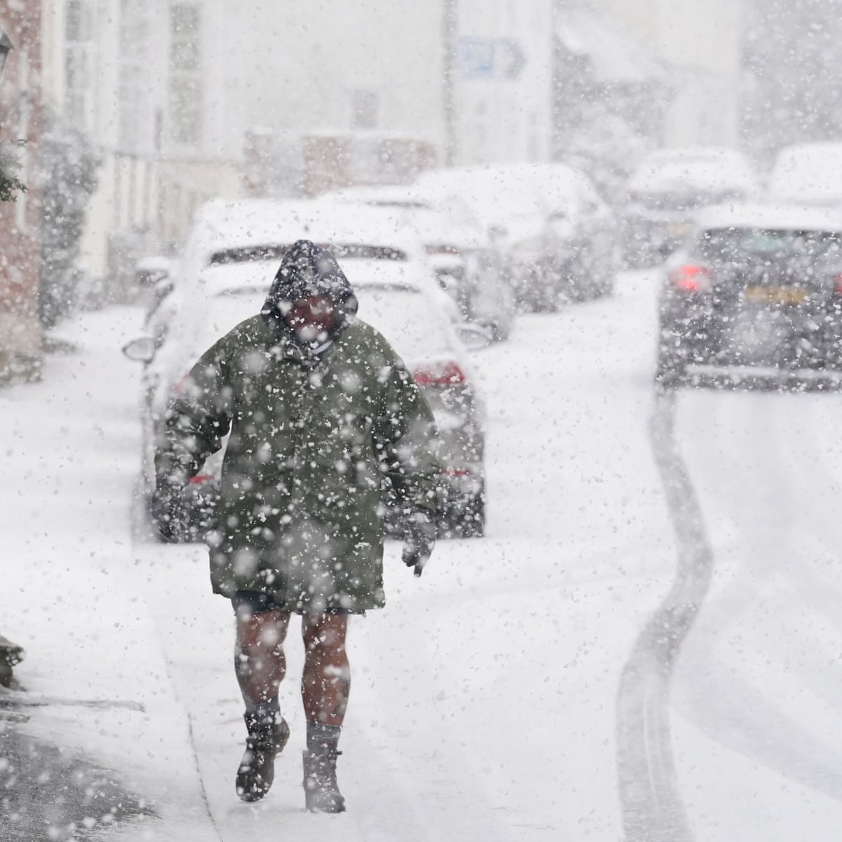 A person walking through a snow flurry in Lenham, Kent. Sleet and